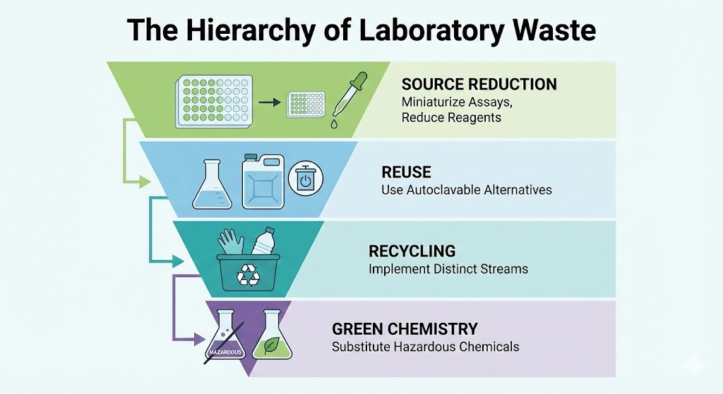 Effective waste management in laboratory testing follows an inverted pyramid hierarchy, prioritizing source reduction over treatment.